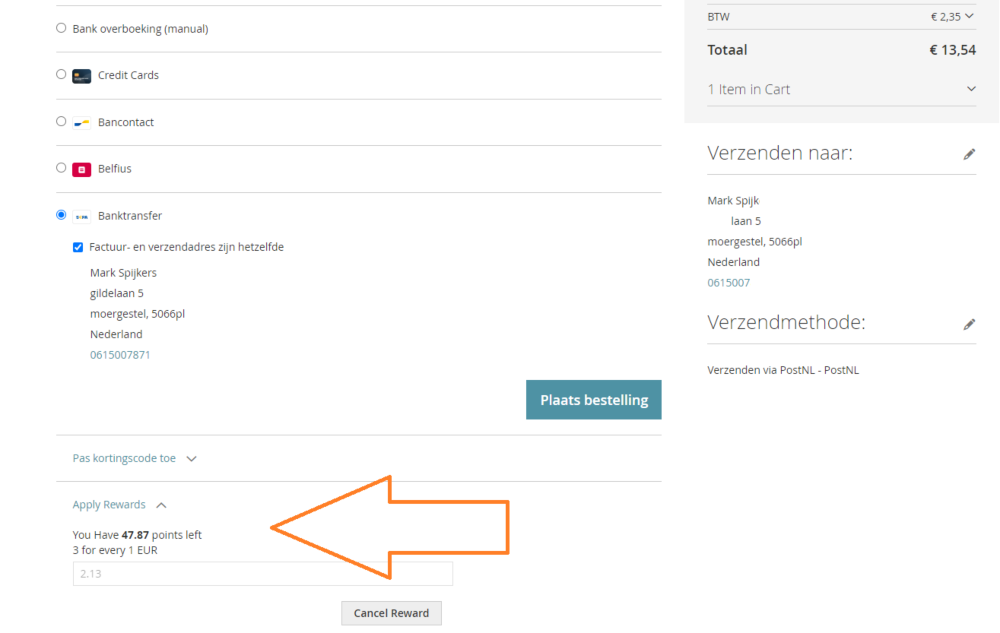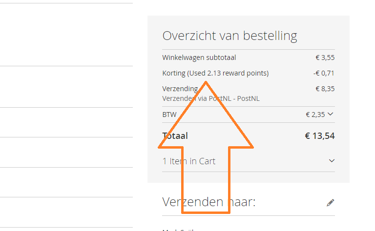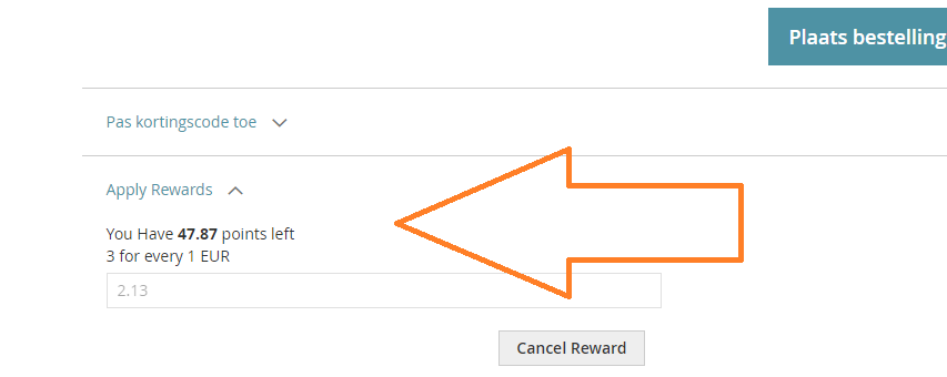 De korting op de heeft een maximum. Het is dus niet mogelijk om de hele order met spaarpunten te betalen. Het systeem rekent het maximum zelf uit. Wilt u dit annuleren, klik dan op cancel reward.